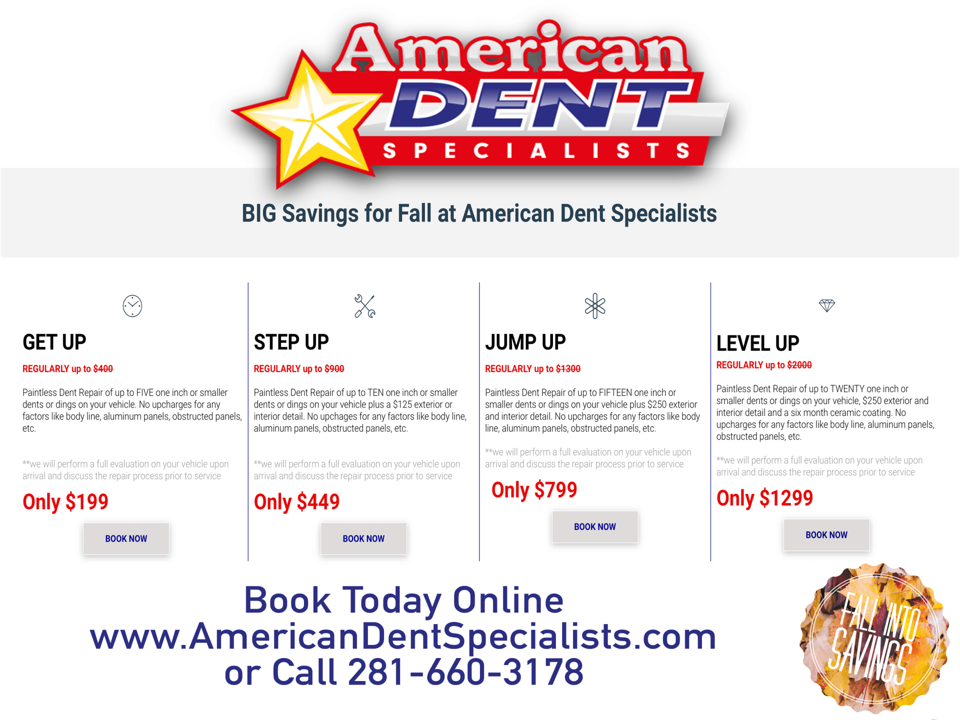 Let’s talk about our new fall promo that we’re running. We’re running four paintless dent repair and auto detailing packages for fall. We’re running the Get Up, Step Up, Jump Up, and Level Up packages, depending on how many dents or dings you have and the condition of the paint on your vehicle. One of these packages might be perfect for you, as you’re coming back from summer, trying to get your vehicle back in a good condition, after summer trips, and the kids being homeschooled for the last six months. So, we put together these four packages the first of which is, the Get Up package. It is up to five quarter size dents, normally up to a $400 value. Now this fall is going to be $199. You can get five quarter size dents repaired with no factors. So, no body lineup charge, aluminum panel up charge, obstructed damage up charge. It’s just a straight $199, five dents up to a quarter in size during the fall, and it’s going to be running all the way to the end of December.